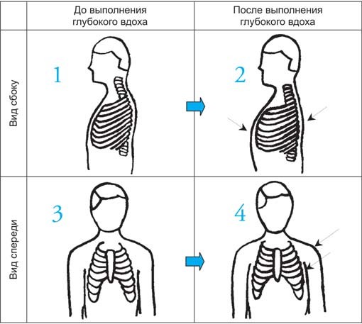Схематичное изображение максимально глубокого вдоха и вторичных движений позвоночника и плечевого пояса. Параметры, характеризующие максимально глубокий вдох: 1 - увеличение переднезаднего размера грудной клетки, 2 - увеличение поперечного размера грудной клетки. Наблюдавшиеся вторичные движения: 3 - уменьшение угла наклона верхнегрудного отдела позвоночника, 4 - смещение плеч назад относительно туловища. Литература 1. Анатомия человека. В 2 т. Т. 1 / под ред. М.Р. Сапина. - 5 е изд., перераб. и доп. - М.: Медицина, 2001. - С. 229 - 23 2. Гамбурцев В.А. Гониометрия человеческого тела. - М.: Медицина, 1973. - С. 14 - 29, 94 - 100, 141 - 145. 3. Епифанов В.А. Лечебная физическая культура и спортивная медицина / В.А. Епифанов. - М.: Медицина, 1999. - С. 454. 4. Физическая реабилитация / под общ. ред. проф. С.Н. Попова. - Ростов н/Д: Изд-во "Феникс", 1999. - С. 206, 214-215.