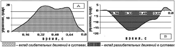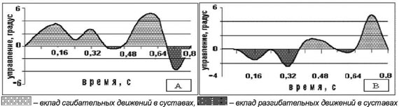 Вычислительные эксперименты показали, что у всех испытуемых существует резерв дальнейшего технического совершенствования, позволяющий увеличить угол поворота первого звена биомеханической системы на 8-15% при оптимизации с кинематическими ограничениями и на 10-39% - при оптимизации без кинематических ограничений (табл. 1). На рис. 1 в графическом виде представлен вклад управляющих движений в плечевых и тазобедренных суставах в формирование оптимальной техники оборота назад на перекладине с ограничениями кинематического управления для всех испытуемых. Анализ рис. 1 показывает, что основная заслуга принадлежит сгибательным движениям как в плечевых, так и в тазобедренных суставах. Наибольший удельный вклад в формирование оптимальной техники упражнения в начальной фазе движения вносят сгибательные движения рук в плечевых суставах, а в заключительной фазе - сгибательные движения ног в тазобедренных суставах. Вклад управляющих движений в плечевых и тазобедренных суставах в формирование оптимальной техники большого оборота назад на перекладине без ограничений кинематического управления представлен на рис. 2. Анализ рис. 2 позволяет сделать вывод о том, что критерием качества выполнения упражнения может служить рационализация техники исследуемого упражнения, которая заключается в выполнении большего сгибательного движения рук в плечевых суставах на фоне меньшего сгибания ног в тазобедренных суставах. В соответствии с вышерассмотренной схемой анализа и синтеза большого оборота назад на перекладине были проведены анализ и последующий синтез большого оборота вперед на перекладине. Результаты прироста функционала приведены в табл. 2. Следует отметить, что процент прироста функционала у разных гимнастов варьируется в широких пределах. Данное замечание особенно актуально для большого оборота вперед на перекладине. Анализ результатов оптимизации (см. табл. 1, 2) позволяет сделать следующий вывод: процент прироста функционала дает возможность судить, насколько техническое мастерство конкретного исполнителя совершенно. Так, малый процент прироста свидетельствует о том, что техника большого оборота на перекладине у данного гимнаста более рациональна, чем техника упражнения у тех исполнителей, у которых процент прироста функционала больше. Техническая подготовленность гимнастов, имеющих в вычислительном эксперименте большой процент прироста функционала, далека от оптимальной, и эти спортсмены могут существенно улучшить свой спортивный результат, только совершенствуя кинематическую структуру упражнения в рамках своих силовых ресурсов. Заключение. Проведенное исследование показало, что предварительно синтезированная в вычислительном эксперименте на ЭВМ оптимальная техника изучаемых упражнений способствует построению более рационального варианта выполнения упражнения. Даже высококвалифицированные гимнасты не полностью используют биодинамические ресурсы в совершенствовании своего технического мастерства. Спортсмены имеют возможность улучшить кинематическую и динамическую структуру исследуемых упражнений на 10-22% только за счет рационализации сгибательно-разгибательных движений в суставах без увеличения своего силового потенциала. В случае отсутствия ограничений амплитуды сгибательно-разгибатель