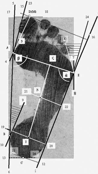 Ключевые слова: стопа, плантография, функциональная устойчивость продольного свода, группа риска, предельное напряжение сводоудерживающего аппарата, физические упражнения. Введение. Стопа как орган опоры и движения играет важную роль в жизни человека. Она является конечным звеном сложной кинематической цепи локомоторного аппарата, осуществляющей согласованную деятельность мышц, костей и суставов во время перемещения человека в пространстве. Нормальная стопа имеет два свода: продольный и поперечный. Потеря сводчатости стопы заканчивается ее статическими деформациями. Они, в свою очередь, приводят к проблемам с ношением стандартной обуви, снижению трудоспособности и даже инвалидизации, способствуют возникновению заболеваний суставов всей нижней конечности, позвоночника, остеохондрозу. Актуально это и для спорта, где на стопу могут действовать нагрузки, близкие к предельным, и следствием функциональной несостоятельности стопы являются перенапряжения, микротравмы и другие виды патологии. Поэтому есть необходимость в своевременном укреплении и функциональной устойчивости сводов стопы, предшествующей появлению ее статических деформаций и их последствий, когда еще возможно укрепление сводоудерживающего аппарата методами физической культуры и сохранения или восстановления трудоспособности. Методика. В исследовании изучалось состояние продольного свода стопы по отпечаткам ее подошвенной поверхности (плантография). Их получали на рабочем месте обследуемого с помощью плантографа собственной конструкции. Отпечатки анализировали графико-расчетным методом, разработанным Г.Г. Потихановой, С.Ф. Годуновым и Н.П. Черниной. С помощью этого метода можно получить показатели, характеризующие состояние всех отделов стопы. В процессе использования метода в лаборатории биомеханики УралГУФКа в него были внесены изменения, повышающие точность получаемых цифровых показателей (см. рисунок).