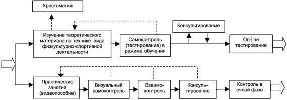 Ключевые слова: дистанционное обучение, информационные и телекоммуникационные технологии, лыжный спорт, методическое проектирование, учебный процесс. Введение. Сегодня нет ни одной сферы человеческой деятельности, которой бы не коснулись технологические достижения: от производственной и финансовой до политической, научной, здравоохранения и культуры. С учетом того что физическая культура и спорт становятся все более заметными социальными и политическими факторами в мире, в современном обществе все острее ощущается нехватка высококвалифицированных специалистов, проявляющих инициативу, творческую самостоятельность, способных решать задачи спорта высших достижений и развивать физическую культуру среди населения, свободно владеющих профессией и хорошо ориентированных в смежных областях, готовых к сотрудничеству и интерактивному взаимодействию в условиях информационного общества. Одними из направлений совершенствования профессионального образования являются внедрение новых образовательных технологий и принципов организации учебного процесса, реализация новых моделей и содержания непрерывного образования, в том числе с использованием современных информационных и коммуникационных технологий (ИКТ). По мнению специалистов в области дистанционного и открытого образования [1, 6, 10], на сегодняшний день наибольший интерес представляют интегрированные педагогические технологии, представляющие различные сочетания очных занятий и дистанционных форм обучения. Опыт применения информационных и коммуникационных технологий в системе подготовки кадров в области физической культуры и спорта только начинает накапливаться. В настоящий момент активно внедряются компьютерные обучающие программы на основе современных мультимедийных средств, в том числе по спортивно-педагогическим дисциплинам: аэробике, гимнастике, спортивным единоборствам и игровым видам спорта. Они открывают большие возможности в совершенствовании методов и средств обучения благодаря усилению наглядности и аудиовизуального воздействия на обучающихся, повышению интереса и мотивации, индивидуализации образовательного процесса [2, 5, 9]. Доказана эффективность дистанционного обучения по ряду дисциплин естественно-научного цикла, педагогике - "Технологии обучения", внедрены системы дистанционного обучения (СДО) в физкультурных вузах "Орбита" (РГУФК), СДО на базе LMS Moddle (СПбГУФК), действует система спортивного дистанционного обучения E-sportlearning, где реализуются программы дополнительного образования в области спортивного менеджмента. Однако в специальной литературе мы не обнаружили данных о практике дистанционного обучения по спортивно-педагогическим дисциплинам, организационных и методических особенностях учебного процесса, педагогических условиях взаимодействия между преподавателем и обучающимися в новой информационной среде. Таким образом, возникает необходимость в разработке новых моделей обучения, интегрирующих дистанционные и традиционные технологии, которые позволят перейти к новому уровню подготовки кадров по физической культуре и спорту, отвечающему требованиям современного общества. При этом рациональная пропорция включения дистанционного обучения в традиционное при сохранении требований и стандартов последнего - задач