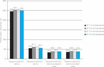 Введение. В программе физического воспитания студентов волей бол занимает важное место. Практически на всех этапах обучения - в начальной, средней и высшей школе - в физическом воспитании используются спортивные игры. В большинстве вузов организуются секции волейбола, а команды участвуют в студенческих и территориальных соревнованиях. В связи с этим возникает потребность в повышении эффективности проводимых занятий, что связано с поиском новых решений в организации учебно-тренировочного процесса. Цель исследования - совершенствование учебно-тренировочного процесса волейболистов и повышение качества физического воспитания студентов на основе методик применения тренажеров и специальных упражнений. Организация исследования. Сравнительный эксперимент, касающийся применения комплекса упражнений на тренажерах и устройствах для развития технических умений и навыков, проведен на двух группах студентов вузов г. Белостока. В исследовании участвовали 24 волейболиста в возрасте 21-26 лет. Экспериментальную группу (ЭГ) из 12 человек составила команда Института финансов и управления (тренер - Е. Новик), контрольную группу (КГ) тоже из 12 человек - команда Института общественной администрации (тренер - Ю. Федорович). Эксперимент длился на протяжении двух семестров (с октября 2001 г. по июль 2002 г.) Второй эксперимент проводился в следующем учебном году и предусматривал разработку и экспериментальное обоснование методики использования упражнений на тренажерах для развития силовых и скоростно-силовых способностей волейболистов. Были применены 18 типов силовых тренажеров: рычажные, блочные фрикционные - для локального, регионального и общего воздействия на мышечные группы верхних и нижних конечностей и туловища в уступающем и преодолевающем режимах. В исследовании участвовали 24 волейболиста тех же ЭГ и КГ. Тренировки в ЭГ проводились один раз в неделю и продолжались 90 мин. Всего тренировочный цикл включал 28 тренировок. В первые три месяца 40% времени на этих тренировках было отведено общеразвивающим упражнениям, выносливости, гибкости, а 60% - силовым и скоростно-силовым упражнениям на тренажерах. В отличие от ЭГ в КГ выполнялись упражнения силового и скоростно-силового характера со штангой, гимнастические, прыжки многоскоки. Методы исследования включали анализ научной и методической литературы; педагогические наблюдения; педагогические контрольные испытания; педагогический эксперимент; математико-статистические методы; инструментальные методы исследования; пульсометрию; метод мониторинга ЧСС; хронометрию; полидинамометрию; видеокомпьютерную хронометрию. Результаты исследования и их обсуждение. На рис. 1 и 2 показаны сравнительные данные ЭГ и КГ в начале и в конце эксперимента. На основании статистического метода сравнения средних значений определены различия между испытуемыми группами на основании критерия Уэлча. В начале эксперимента существенных различий между данными в группах не было. По окончании эксперимента выявлено, что показатели в ряде тестов в ЭГ выше, чем в КГ по разнице средних значений (р < 0,05). Существенно различаются показатели в тестах: на прыжковую выносливость, в прыжке в длину с места, в прыжке вверх с места, прыжке вверх на левой ноге и наклоне туловища (статическая сила) назад (р < 0,05). В остальных тестах, хо