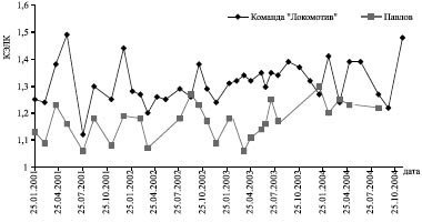 Рис. 1. Многолетняя динамика КЭЛК команды "Локомотив" и спортсмена Павлова Очевидно, при продолжительном соревновательном периоде современные футболисты не могут позволить себе более интенсивную подготовку, которая может ухудшить функциональное состояние, и в частности КЭЛК. Таким образом, КЭЛК, с одной стороны, является показателем двигательной одаренности спортсменов, а с другой - показателем, позволяющим путем проб и ошибок определить потолок физической работоспособности для каждого игрока - оптимальную для него величину PWC170 [4].