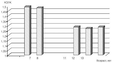 Рис. 2. Достоверные различия КЭЛК у младших школьников и подростков (p < 0,001) В следующем поколении юных футболистов "Локомотива" - 1990 г. р., (также тренируемых братьями Горбачевыми) обратил на себя внимание К. Павлов, считавшийся ведущим игроком команды (см. рис. 1). На рисунке видно, что КЭЛК этого спортсмена был устойчиво ниже средних данных по команде за все 4 года наблюдений (1,05-1,25). С этим спортсменом руководство "Локомотива" заключило контракт, и он был включен в команду более высокого уровня. У находящихся под нашим наблюдением взрослых лыжников (КМС и МС), нагрузки которых несравненно объемнее, чем у футболистов: месячные объемы циклических нагрузок в подготовительном периоде доходили у них до 1200 км и больше, даже у женщин, не обнаружено характерного снижения КЭЛК в соревновательном периоде, хотя объемы и были снижены. Очевидно, лыжники жертвуют локомоторной координацией в пользу физической работоспособности, чего не могут позволить себе футболисты. За многие годы наших наблюдений такие низкие величины КЭЛК, как 1,1-1,2, были обнаружены только у футболистов. Футболисты благодаря эмоциональной насыщенности игры, ее переменной мощности, достигают высокой физической работоспособности, используя значительно меньшую величину нагрузок, чем лыжники, сохраняя оптимальный уровень локомоторной координации. Сенситивный период становления локомоторной координации и его энергетические и координационные проявления. В настоящее время тренеры Горбачевы работают с детьми дошкольного и младшего школьного возраста. Ежемесячно обследуя их, мы впервые убедились, что в координации эти спортсмены существенно уступают подросткам. Их КЭЛК =1,47-1,49 против 1,25 у подростков 11-12 лет (рис. 2). Этот факт позволил нам сделать заключение о том, что сенситивный период становления локомоторной координации приходится на возраст от 8 до 11 лет. Мы полагаем, что становление локомоторной координации является причиной снижения показателей удельного аэробного энергообеспечения у старших подростков по сравнению с младшими подростками, у которых в 11-12 лет наблюдается "расцвет аэробики". Вследствие отставания развития процессов координации у младших школьников физические нагрузки оказывают на их организм глубокое возмущающее воздействие. Это приводит к преимущественному стимулированию энергетических процессов адаптации к нагрузкам. Давно уже обнаружены факты наибольших относительных размеров сердца, относительных величин СОК и МОК (систолического и минутного объемов крови) в 11-12 летнем возрасте. Относительные величины МПК, измеренного прямым путем, также наибольшие в этом возрасте. Развитие процессов координации функций к 11-12 годам снижает возмущающее воздействие нагрузки на организм за счет более экономичного функционирования и тем самым - выраженность энергетических проявлений работоспособности (МОК, СОК, МПК) и т. п. Таким образом, давно защищаемое нами представление о противоречивости энергетического и координационного путей адаптации организма к нагрузкам нашло экспериментальное подтверждение.
