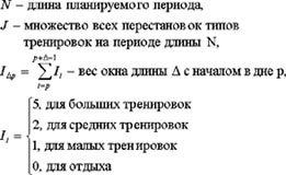 БСк - тренировка с большим объемом спринтерской работы и малыми объемами равномерно дли тельных и/или повторных мягких методов тренировки; БП - тренировка с большим объемом повторной жесткой работы и малым объемом равномерно длительного бега; БСп - тренировка с большим объемом специальной и малыми объемами равномерно длительной или повторной мягкой работ; БРб - тренировка с большим объемом равномерно длительного и/или повторного мягкого бега и малыми объемами скоростной и/или повторной жесткой работ; С - тренировки, средние по общей нагрузке, со средними объемами включенных в них типов работ. Объемы работ, из которых состоит средняя тренировка, определяются при помощи весовой функции и зависят от объемов работ в ближайших тренировках; М - малые тренировки, состоящие из восстановительного бега (кроссовый бег низкой интенсивности); О - отдых. Следует отметить, что классификация тренировок и алгоритмы планирования зависят от постановки задачи планирования. В настоящей статье рассматривается одна из возможных постановок. Отдельное тренировочное занятие. Каждая большая или средняя тренировка - это последовательное выполнение одного или нескольких из указанных выше пяти видов нагрузки (Рб, Пм, Пж, Ск, Сп) через определенные промежутки отдыха. При задании последовательности работ учитываются тип тренировки, а также правила чередования и совместимости работ в одной тренировке. Работы одинаковой направленности не могут стоять рядом, в одной тренировке не используются "специальная" и "скоростная", а так же "специальная" и "повторная жесткая" нагрузки. Для каждого типа тренировки задается множество допустимых последовательностей (цепочек) работ (табл. 1). Для каждой цепочки задается частота ее использования. Для каждого фрагмента работы всех цепочек задается допустимый диапазон объемов. Нормы нагрузки. Нормы нагрузки задают количество тренировок различного типа на планируемом тренировочном цикле, объемы работ и методов для планируемого цикла и отдельного тренировочного занятия. Распределение типов тренировок в тренировочном цикле. Наличие больших тренировок, с одной стороны, обеспечивает высокий тренировочный эффект, а с другой - ведет к перетренированности и травмированию спортсмена. Очевидно, что эти условия находятся в противоречии. Для понижения риска перетренировки при расстановке тренировок различных типов используется принцип равномерности, который описывается ниже. Расстановка тренировок в планируемом периоде проводится с учетом критериев качества, которые также накладывают ограничения на задание норм нагрузки. Так, разведение повторных и специальных тренировок (данные тренировки не должны стоять друг за другом на множестве больших тренировок) определяет соотношение количества больших тренировок разного типа: |N1 - N2| < 1, N1 = NБСп + NБП, N2 = NБСк + NБРб NБСп, NБП , NБСк, NБРб - количества больших тренировок соответствующих направленностей. Кроме понятия "локальная нагрузка", нами введено понятие интегральной нагрузки (I), величина которой является мерой воздействия на организм в целом. Приводимые нами ниже критерии качества должны обеспечить следующее: минимизируются максимальные значения как интегральной, так и локальной тренировочных нагрузок в окне любой ширины. Выполнение критериев приводит к равномерному расп