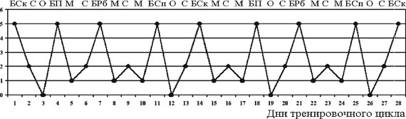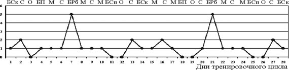 Примечание. С1 - средняя, стоящая рядом с БРб; С2 - средняя, стоящая рядом с БСк; С3 - средняя, стоящая межу БРб и БСп или между БРб и БП; С4 - средняя, стоящая между БСк и БСп или между БСк и БП. Рис. 1. Уровень интегральной нагрузки в различные дни цикла Рис. 2. Уровень нагрузки аэробного характера в различные дни цикла Рис. 3. Уровень нагрузки анаэробного характера в различные дни цикла Третье. В предметном плане научную группу объединяют проблема, над которой группа работает, принципы, общий подход, план изучения предмета исследования и т.д. Все это - составные части собирательного понятия "научная программа". Совместная исследовательская программа включает в себя общий замысел групповой деятельности (постановка проблемы и возможные пути ее решения), теоретические, операциональные, методические и даже нравственно познавательные ориентации ее автора, содержит более или менее четкое представление о проектируемом результате и стратегии его достижения, обозначает конкретные стадии работы, "пункты" необходимого и возможного научного взаимодействия членов группы, включает планирование ориентировочных сроков и форм научного общения и обсуждения промежуточных результатов исследования и т.п. [1, с. 123]. Четвертое. Описанные выше задачи и подходы к их решению могут быть использованы в качестве основы научно-исследовательских программ научных групп, ставящих перед собой задачу разработки аналогичных экспертных систем в других видах спорта. А в сегодняшних условиях отсутствия программы развития спортивной науки эти научно-исследовательские программы могут стать общими ориентирами, за дающими направление исследований. Это позволит повысить эффективность НИОКР, увеличить приращение знаний. Литература 1. Аллахвердян А.Г. Психология науки / А.Г. Аллахвердян и др. - М., 1998. 2. Хасин Л.А. Компьютерное планирование спортивной тренировки - теоретические подходы // Материалы Всероссийской научной конференции "Информационные технологии и технические средства обучения и тренировки в сфере физической культуры и спорта" / под общ. ред. Л.А. Хасина. - Малаховка: НИИТ МГАФК, 2004. 3. Хасин Л.А. Информатизация отрасли "Физическая культура и спорт" и экспертные технологии (сообщение второе) / Л.А. Хасин, С.Б. Бурьян, С.В. Минков, А.Б. Рафалович // Теория и практика физ. культуры. - 1996. - № 10. - С. 41 - 45. 4. Ярошевский М.Г. Программно ролевой подход и современная наука / М.Г. Ярошевский, А.В. Юревич, А.Г. Аллахвердян // Вопросы психологии. - 2000. - № 6. - С. 3 - 18.