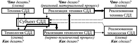 Схема 4. Схема осуществления освоенного СДД. Тонкие стрелки - пути формирующих связей, жирные - основной путь реализации субъектом техники СДД, пунктирные - пути информации обратной связи