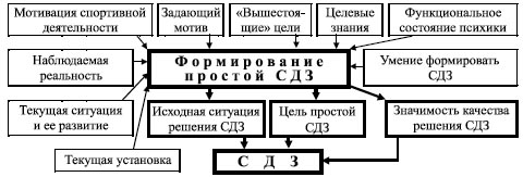 Схема 7. Блок-схема решения СДЗ. АДП - актуализационная двигательная программа, ДМП - двигательная метапрограмма Технология СДД. Но ведь тренера и спортсмена всегда интересует вопрос "как нужно делать?", имея в виду внутреннее СДД. Ответ на вопрос - анализ схемы внутреннего действия, подлежащей реализации, чтобы внешнее СДД было таким, как хочется. Эту схему можно назвать технологией СДД. Она формируется спортсменом в ходе освоения СДД, и тренер должен ему помогать. Вопреки обычным представлениям, исходной схемой для осуществления уже освоенного СДД служит не техника СДД (схема внешнего действия, системы телодвижений и движений), а его технология (схема внутреннего действия), реализуя которую (т.е. осуществляя внутреннее действие) спортсмен тем самым реализует соответствующую технику СДД (осуществляет внешнее действие). Реализация техники как процесс запоминается или фиксируется иным образом (видеосъемка и др.), оставляя, таким образом, "след" - реализованную технику как схему реально осуществленного процесса. Сказанное принципиально. Это значит, что спортсмен, желательно с помощью тренера, должен формировать у себя такую технологию СДД и такую способность ее реализовать, чтобы в результате была хорошо (как мы хотим) реализована техника СДД - нужное нам внешнее действие (схема 4). Двигательная задача. Можно начать с блок-схемы компонентного состава простой СДЗ (схема 5). Исходная ситуация - мысленная модель реальности в момент начала двигательной части решения СДЗ. Этот момент может почти совпасть с моментом сформирования СДЗ, и тогда исходная ситуация - модель существующей реальности. Если же этот момент отставлен во времени, исходная ситуация - мысленленная модель воображаемой реальности. Цель СДЗ - преобразовать (более или менее определенным способом) исходную ситуацию своей активностью (с учетом ее развития под влиянием других факторов) в желаемую конечную (модель воображаемой реальности). Схема 6 иллюстрирует формирование простой СДЗ. Когда СДЗ сформирована, ее нужно начать решать (отказ от решения СДЗ - это вариант ее решения). Решение СДЗ представлено схемой 7. Навыки и умения. Вопрос о понятиях "навык" и "умение", можно сказать без преувеличения, - больной вопрос. В любом психологическом словаре умение трактуется как совокупность навыков и знаний, из чего следует, что умение иерархически выше навыка. Но в нашей сфере полвека назад внедрено другое понимание: умение - это то, что, совершенствуясь и "автоматизируясь", перерастает в навык. Развивая это представление, многие специалисты считают навык "высокоавтоматизированным" и высокосовершенным умением. Сразу возникает вопрос: в какой момент умение превращается в навык? Когда становится "высокоавтоматизированным"? Значит, и умение может быть "высоко (только чуть меньше) автоматизированным"? Высоко (только чуть меньше) совершенным? А может умение быть более "автоматизированным", чем другого рода навык? Если навык по определению совершенен, можно ли его совершенствовать? Какой уровень считать "совершенным"? Выходит, между умением и навыком "различимого различия" нет. Внутренняя противоречивость концепции очевидна. Но она господствует, ее тиражируют в учебниках, пособиях, статьях, монографиях, диссертациях, внушают студентам. В предлагаемой здесь концепции навык "привязан" к дейс