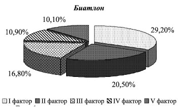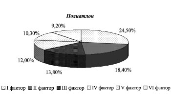 III фактор во многом связан с общей суммой очков за длину и технику прыжка с трамплина К-120 (0,891) и скоростно-силовую подготовленность на дистанции 10 и 15 км (соответственно 0,813 и 0,784). Его вклад составил 17,4 %. Этот фактор следует объяснять как фактор общей многоборной подготовленности при ведущей роли скоростно-силовой подготовленности. IV фактор показывает статистические достоверные связи показателей лыжной гонки в эстафете 3х7,5 км (0,745) с показателями функциональной подготовленности и специальной выносливости (0,715), вклад - 13,1 %. Его можно определить как фактор подготовленности в лыжной гонке на выносливость. V фактор следует рассматривать как фактор скоростно-силовой подготовленности и координации движений в полете. Его образовали прыжок на лыжах с трамплина мощностью К-90 (0,695) и лыжная гонка на дистанции 10 км через 4 ч после прыжков (0,671), вклад - 11,3 %. Результаты факторного анализа спортсменов, специализирующихся в зимнем полиатлоне, выявили 6 факторов, на долю которых приходится 87,5 % общей дисперсии выборки (рис. 3). I фактор характеризуется значительными факторными нагрузками по следующим показателям: сумма очков в зимнем полиатлоне (0,865) и лыжная гонка на дистанциях 5 и 10 км (0,841 и 0,853), функциональная и скоростно-силовая подготовленность с аэробной производительностью. Его вклад в его общую дисперсию выборки составил 24,5 %. II фактор может быть представлен как фактор скоростно-силовой подготовленности в лыжной гонке на дистанциях 3 и 5 км (0,713 и 0,712). Вклад этого фактора - 21,4 %. III фактор имеет высокие веса с подтягиванием на перекладине (0,813) и сгибанием и разгибанием рук в упоре лежа (0,820) и силовыми показателями, интерпретируется как фактор силовой подготовленности (вклад - 13,8 %). IV по значимости фактор образуют показатели стрельбы стоя (0,806) и показатели физического развития (0,596). Его следует понимать как фактор тонкой специфической стрелковой подготовленности (вклад - 12,0 %). Вклад V фактора составил 10,3 %, в него вошли показатели скоростной выносливости на дистанциях 5 и 10 км (0,807 и 0,830). VI фактор - последовательность выступлений в видах многоборья (0,592). Его вклад составил 9,2 %. Сопоставительный анализ ведущих факторов, определяющих эффективность соревновательной деятельности, выявил различия в структуре и подготовленности к достижению результатов на моделях биатлонистов, лыжников двоеборцев и полиатлонистов. Анализ структуры соревновательной деятельности и подготовленности в зимних многоборьях (см. таблицу) с использованием методов математической статистики позволяет утверждать, что каждое многоборье - это самостоятельный специфический вид спорта, а не сумма выступлений в нескольких различных видах. Структура соревновательной деятельности в конкретном виде зимнего многоборья предъявляет жесткие требования как к физическому состоянию спортсменов (генетически обусловленные предпосылки), так и к комплексной спортивной подготовленности. Этот методический подход отрицает механический перенос полученных экспериментальных данных по одной возрастной или квалификационной группе на другую, а также данных, полученных для женщин, на мужской контингент. Для построения этапных модельных характеристик соревновательной деятельности спортсменов должны браться результаты, достигнутые выдающимися спортсменами за период становления спортив