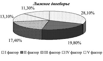 Специфика зимних многоборий - это включение разнохарактерных нагрузок. В биатлон входят: лыжная гонка и стрельба с резкими остановками на рубежах, которые отличаются друг от друга структурой, характером энергообеспечения, продолжительностью и силой воздействия, что предъявляет к системам организма повышенные требования. Каждый вид лыжного двоеборья (северной комбинации) - в отдельности прыжки с трамплина и лыжная гонка на дистанции 10 и 15 км и эстафета 3х7,5 км, гонка преследования по Гундерсену для своего совершенствования требует широкого круга средств и методов, что усложняет управление тренировочным процессом. Условия проведения соревнований по полиатлону (пулевая стрельба стоя, силовая гимнастика и лыжная гонка) также имеют свою специфику. В биатлоне соревнование проводится в один день, в лыжном двоеборье в два, а в полиатлоне в три дня. Имеются другие особенности зимних многоборий, которые позволяют утверждать, что соревновательная деятельность зимних многоборцев не имеет аналогов с таковой в других видах спорта. С целью исследования структуры соревновательной деятельности (ССД) и подготовленности в различных многоборьях в группах с разным составом (возраст, пол, квалификация) факторному анализу были подвергнуты следующие показатели: результаты отдельных дисциплин, входящих в различные многоборья; тесты отдельных двигательных способностей; функциональные возможности, антропометрические показатели и т. д. Сравнительная характеристика показателей тестирования и исследования факторной ССД и подготовленности в различных многоборьях выявила, что по количеству выделенных факторов и по проявлению отдельных двигательных способностей, ведущие факторы в исследуемых многоборьях имеют значительные отличия у мужчин высокой квалификации (КМС и МС), специализирующихся в биатлоне, лыжном двоеборье, полиатлоне. В биатлоне (рис. 1) выявлено пять факторов, на долю которых приходится 87,5 % общей дисперсии выборки, определяющих спортивные достижения: I фактор - специальная и скоростная выносливость, способствующая аэробной и анаэробной производительности на дистанции 20, 15, 10, 7,5 км. Факторные веса здесь соответственно 0,911; 0,873; 0,814; 0,794. Сюда вошли показатели специальной скоростной выносливости (0,886). Вклад в обобщенную дисперсию выборки составил 29,2 %. II и III факторы разделились. II фактор показывает положительные веса в стрельбе по установкам на дистанции 20 км (0,860) и 15 км (0,881) и показателям скоростно-силовой подготовленности (0,795), его вклад составил 20,5 %. III фактор образован по времени нахождения на 4 огневых рубежах (0,691) и качеству стрельбы по установкам (0,670) с вкладом 16,8 %. В IV фактор вошли уход с огневого рубежа (0,671) и прохождение финишного отрезка 2,5 км на дистанциях 20 и 15 км, характеризующие скоростную выносливость (0,674 и 0,664) и показатели физического развития (0, 544). Вклад этого фактора составил 10,9 %. V фактор - общий вклад гонки на дистанции 20 км и стрельбы на 4 огневых рубежах (равен 0,667) и вклад его в обобщенную дисперсию выборки (составил 10,1 %).
