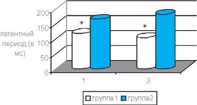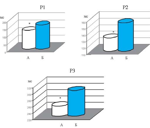 Рис. 1. Латентность зрительного ВП (P1, P2, P3 волн): А - группа спортсменов, Б - контрольная группа. Здесь и на рис 2, 3, 4 звездочкой обозначена статистическая значимость различий между группами (p<0,01) Очевидно, что сокращение времени реакции на зрительные стимулы у спортсменов игровиков происходит за счет сокращения числа задействованных нервных клеток и синаптических контактов. При исследовании когнитивного потенциала Р300 полученные результаты отличались от изложенных выше. Латентный период когнитивного ВП Р300 у спортсменов был достоверно ниже, чем в КГ, тогда как амплитуда - в полтора раза выше (рис. 3). Когнитивный потенциал Р300 регистрируется в центрально-теменной области, т.е. в зоне расположения третичных полей коры, выполняющих функции анализа и синтеза. Для его регистрации испытуемому подается два типа раздражителей, которые он должен распознавать и выполнять на каждые соответствующие действия (нажатие кнопки). При регистрации обычных зрительных ВП анализ поступающей ин формации не осуществляется. На втором этапе была исследована зависимость характеристик зрительных ВП головного мозга от результативности тренировочной деятельности у спортсменов баскетболистов. По результатам тестирования специальной физической подготовленности группа спортсменов баскетболистов была разделена на 2 подгруппы: были отобраны 10 спортсменов, показавших наилучшие результаты по всем тестам (первая подгруппа) и 10 показавших наихудшие результаты (вторая подгруппа). Различия между подгруппами были достоверны (р<0,01) по результатам всех трех тестов (см. таблицу). Длительность латентного периода зрительных ВП у спортсменов, входящих в первую подгруппу, была достоверно выше в сравнении со второй подгруппой (рис. 4). Амплитуда зрительных ВП у спортсменов в двух подгруппах не различалась. Полученные результаты свидетельствуют, что цен тральная нервная система баскетболистов в ходе тренировочного процесса более эффективно осуществляет дифференцировку раздражителей. При отсутствии необходимости оценивать характер поступающего стимула (как при регистрации зрительных ВП) максимально сокращается число задействованных в его обработке нейронов и синаптических контактов. Если же нужно оценить качество стимула и выбрать тип реагирования на него (в случае с когнитивным потенциалом Р300), у спортсменов в процесс вовлекается большее количество нейронов, чем у нетренированных людей, однако латентный период ответа все равно остается ниже. Снижение амплитуды и латентного периода зрительных ВП свидетельствует о более быстром протекании процессов передачи и переработки стимула у спортсменов, при этом в коре головного мозга создаются новые временные связи, вследствие чего улучшается двигательная координация. Увеличение амплитуды и уменьшение латентного периода когнитивных ВП Р300, которые характеризуют анализ информации, свидетельствует об ускорении процессов переработки информации у спортсменов игровиков по сравнению с нетренированными испытуемыми.