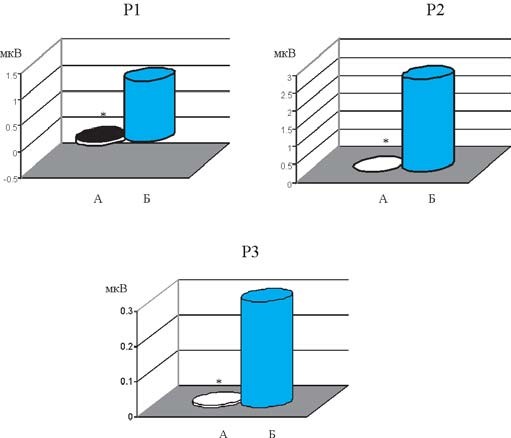 Рис. 2. Амплитуда зрительных ВП (Р1, Р2, Р3 волн): А - группа спортсменов, Б - контрольная группа Результаты выполнения специальных тестов в обследованных подгруппах , М±т