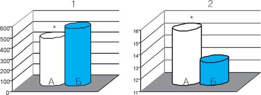 Рис. 3. Латентность (1) и амплитуда (2) когнитивных потенциалов (Р300) у спортсменов игровиков (А) и в контрольной группе (Б) (центрально теменные отведения)