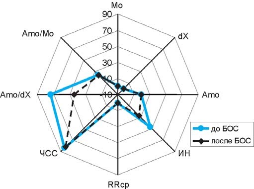 Функциональный "портрет" до и после курса тренинга с БОС В результате применения тренинга с БОС у испытуемых отмечена нормализация всех параметров сердечного ритма (см. рисунок), вегетативное обеспечение деятельности заметно улучшилось (у 4,76% девушек был достигнут уровень достаточного вегетативного обеспечения, а у 28,57% - избыточного). Положительное влияние этого тренинга на вегетативное обеспечение деятельности связано с угнетением симпатического отдела вегетативной нервной системы, что способствует повышению уровня адаптации и переносимости физических нагрузок. После проведения курса тренинга с БОС отмечено значительное улучшение координационных способностей, особенно чувства ритма (до тренинга 4,85±0,24 с, после - 0,42±0,06 с) (табл. 3). Таким образом, анализ параметров вариабельности сердечного ритма позволяет охарактеризовать состояние вегетативного гомеостаза, уровень адаптивных возможностей и функциональных резервов у студенток, занимающихся оздоровительной аэробикой. В результате применения тренинга с БОС в подгруппе студенток с недостаточным вегетативным обеспечением деятельности происходит нормализация вегетативного баланса и наблюдается положительная динамика в развитии координационных способностей. Следовательно, использование метода КИГ и тренинга с БОС позволяет объективно оценить функциональное состояние, особенности вегетативного обеспечения функциональных резервов организма студенток, выявить состояния утомления и перетренированности и рекомендовать наиболее благоприятный режим тренировки и восстановления после физических нагрузок. Литература 1. Баевский, Р.М. Анализ вариабельности сердечного ритма при использовании различных электрокардиографических систем: метод. рекомендации / Р.М. Баевский, Г.Г. Иванов, Л.В. Чирейкин и др. // Уральский кардиологический журнал [Электрон. ресурс]. - 2002. - Вып. 1. 2. Бальсевич, В.К. Интеллектуальный вектор физической культуры человека / В.К. Бальсевич // Теория и практика физ. культуры. - 1991. - № 7. - С. 37-41. 3. Биоуправление-2: Теория и практика / Ред. М.Б. Штарк. - Новосибирск: Наука, 1993 - 229 с. 4. Гаркави, Л.X. Адаптационные реакции и резистентность организма / Л.X. Гаркави, Е.Б. Квакина, М.А. Уколова. - Ростов на Дону: Изд-во Ростовск. ун-та, 1990. 5. Дрижика, А.Г. К проблеме оптимизации соревновательной деятельности путем подстройки ее ритмо-темповой структуры под индивидуальный нейродинамический ритм / А.Г. Дрижика, Л.Ф. Шевцова // Теория и практика физ. культуры. - 1992. - №1. - С. 10-11. 6. Дегтярева, Е.И. Новые виды и формы физической активности среди женщин в зарубежных странах и в России: автореф. дис. ...канд. пед. наук / Е.И. Дегтярева. - ВНИИФК, 1998. - 26 с. 7. Лубышева, Л.И. Ценности физической культуры в здоровом стиле жизни / Л.И. Лубышева, В.К. Бальсевич // Материалы Международной конференции "Современные исследования в области спортивной науки". - СПб.: НИИФК, 1984. - С. 124-125. 8. Селуянов, В.Н. Основы теории оздоровительной физической культуры / В.Н. Селуянов, Е.Б. Мякинченко: учеб. пособие для инструкторов оздоровительной физической культуры. - М., 1994. 9. Шилько, В.Г. Физическое воспитание студентов с использованием личностно ориентированного содержания технологий избранных видов спорта / В.Г. Шилько. - Томск: ТГУ, 2005. 10. Stauss, H.M. Heart rate variability / H.M. Stauss // Am. J. Physiol: Regulatory, Integrative and Comparative Physiology. - 2003. - № 285(5). - Р. 927-931. 11. Tulppo, M.P. Effec