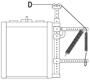 Рис. 1. Машина безынерционного управляющего воздействия Тренажер представляет собой телескопическую стойку, за фиксированную на столе для армрестлинга. К стойке прикреплены два рычага: нижний, расположенный перпендикулярно стойке, посажен на втулку с фиксатором таким образом, что может перемещаться вверх или вниз по стойке, а верхний рычаг посажен на ось и может подниматься, переходя из горизонтального положения в вертикальное. На верхнем торце телескопической стойки закреп лен блок, который можно поднять или опустить, фиксируя телескопическую стойку на разной длине. Как нижний, так и верхний рычаги снабжены отверстиями для зацепления пружин и троса. К тросу, перекинутому через блок, придела на рукоятка, за которую спортсмен тянет на тренировке. Натяжение троса определяет силовую характеристику движения, которая может фиксироваться тензодатчиком, вставленным в разрыв троса. Исследуя графики силы реальных движений, выполненных на тренажере с таким узлом переменного сопротивления, Ю.Т. Черкесов, В.Г. Свечкарев и А.С. Кожемов показали, что на нем реализуются названные режимы сопротивления, и доказали их методическую ценность. Однако узел переменного сопротивления не изучался как таковой: не было сделано теоретического расчета проявляемой силы, её зависимости от положения рукоятки. Кроме того, кажется невероятным, что с помощью пружин (для которых справедлив закон Гука) можно реализовать постоянную величину силы натяжения троса на некотором участке перемещения рукоятки, а тем более убывание этой силы. Последующие рассуждения позволят доказать, что это так.