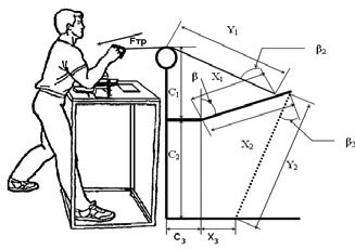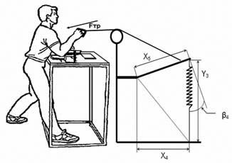 Рассмотрим математическую модель с параметрами, присущими реальному узлу переменного сопротивления: расстояние от блока до верхнего рычага C1=0,5 (м), расстояние от верхнего рычага до нижнего C2 =0,71 (м), расстояние от стойки до оси вращения С3 =0,045 (м). С помощью такого узла нетрудно реализовать режим возрастающего сопротивления. Для этого достаточно положить расстояние от оси вращения верхнего рычага до точки прикрепления троса X1=0,315 (м), от оси вращения верхнего рычага до верхней точки прикрепления пружины X2 =0,315 (м), от проекции оси вращения на нижний рычаг до точки прикрепления нижнего конца пружины X3=0,515 (м). Устройство имеет ограниченное число точек прикрепления пружин и троса (по девять на каждом рычаге). Убывающий режим сопротивления реализуется также достаточно просто: X1=0,315 (м), X2=0,315(м), X3=0,115(м). Постоянный (квазипостоянный) режим (на пятипроцентном уровне точности) реализуется с помощью двух групп пружин, расположенных в рассмотренных ранее двух положениях. Первая группа пружин, создающая возрастающий режим сопротивления, обладает коэффициентом жесткости в два раза большим, чем вторая. Для расчета нескольких групп пружин достаточно сложить значения силы для каждой из их групп. Величину натяжения троса можно менять с помощью изменения расстояния C2, количества пружин и, если не нужно точно придерживаться режима сопротивления, то и изменением положения точек прикрепления пружин и троса. Для создания убывающе-возрастающего режима сопротивления необходимо добавить еще один упругий элемент, который конструктивно представляет собой пружину, один конец которой соединен с верхним рычагом, а другой - с тросом, длина которого может регулироваться в зависимости от потребности во включении упругого элемента в нагрузку в нужной фазе движения (см. рис.1). Для расчета момента, создаваемого этим элементом, нужно ввести координаты прикрепления верхнего (Х5) и нижнего (Х4) конца и начальную длину всего упругого элемента (Y3n) и его собственно упругой части (Y30) (рис.3), тогда: Mпт = FптX5cоs β4, где