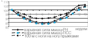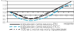 Рис. 3. Динамика скоростно-силовых показателей у бегуний на короткие дистанции в период проведения наблюдений Обсуждение результатов исследования. Проблема полового диморфизма в спорте высших достижений - одна из интереснейших и в то же время слабо освещенных в современной спортивной науке. До сих пор нет однозначной оценки этого феномена в теории и практике отбора и подготовки спортсменов. Мало рассматривается представлений о маскулинности и фемининности как половых типах и недостаточно показана необходимость их учета при суждении о тех или иных различиях между спортсменами и спортсменками. Между тем согласно ряду работ учет степени выраженности маскулинности и фемининности существенно изменяет картину, что было выявлено как на детях [7], так и на взрослых людях [23]. Примечательно и то, что исследование, проведенное в США, показало наличие наиболее высоких баллов по шкале маскулинности у чернокожих женщин, за ними следовали латиноамериканки, а затем белые женщины [17]. Сегодня обоснованность жесткого разделения людей только на два противоположных, не совпадающих по своим природным характеристикам пола ставится биологами под сомнение. Они выделяют несколько уровней сексуальной организации человека [9]: генетический пол (определенный набор генов); гонадный пол (железы внутренней секреции); морфологический пол (наружные и внутренние половые органы); церебральный пол (дифференциация мозга под влиянием тестостерона). Выявлено [24], что головной мозг несет в себе возможности программирования поведения и по мужскому, и по женскому типу. Поэтому маскулинность-фемининность описывают как модель в виде сообщающихся сосудов, где "свой" сосуд должен быть заполнен больше, чем "чужой". Кроме того, мужские и женские половые гормоны продуцируют как мужской, так и женский организмы, а гормональная маскулинность или фемининность определяется по преобладанию тех или других [22]. Откуда же берутся маскулинные женщины, являющиеся наиболее "ценными" для скоростно-силовых видов легкой атлетики?