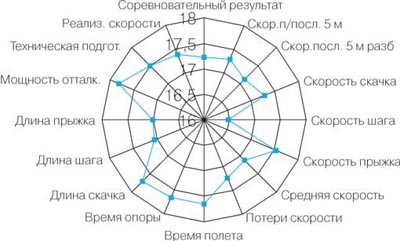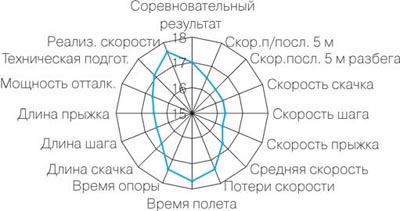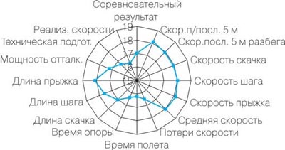 Рис. 3. Диаграмма технической подготовленности для прыгунов "силовой" группы 4. Исследование внутрииндивидуальных связей в структуре специальной подготовленности прыгунов. Процесс управления технической подготовкой прыгунов будет более эффективным, если он основывается на исследованиях индивидуальной структуры их технической подготовленности. Далеко не всегда показатели, информативные для группы спортсменов, являются информативными для отдельных спортсменов, входящих в эту группу. Особенно это характерно для выдающихся атлетов, которые зачастую добиваются результатов за счет очень высокого уровня развития каких-то отдельных сторон подготовленности при относительно средних других показателях. Поэтому именно на этапе спортивного совершенствования чрезвычайно важно учитывать индивидуальные качества спортсменов, сильные стороны их подготовленности, и на основе этого строить тренировочный процесс. На рис. 4 для примера представлены характерные связи в структуре соревновательного упражнения, ведущие к росту результата у высококвалифицированного прыгуна, полученные на основе корреляционного анализа параметров технической подготовленности спортсмена в попытках соревновательного сезона (n = 30). Коррекция индивидуальных показателей технической подготовленности осуществляется при направленности тренировочных воздействий на те элементы соревновательного упражнения, которые определяют результат спортсмена (в данном конкретном случае - увеличение горизонтальной скорости прыжка, снижение потерь скорости в отталкиваниях, увеличение длины последней фазы тройного прыжка). Целенаправленное воздействие на данные параметры техники соревновательного упражнения осуществляется с помощью подбора специальных упражнений и двигательных установок при совершенствовании техник прыжка.