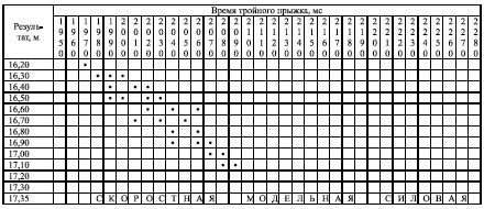 Рис. 5. Параметры результата и времени тройного прыжка в попытках В. Гущинского 5. Сравнительный анализ технической подготовленности в удачных и неудачных попытках. Методика управления подготовкой прыгунов и прыгуний на основе сравнительного анализа технической подготовленности в удачных и неудачных попытках прыгунов также дает возможность выделить параметры в структуре технической подготовленности спортсменов, преимущественно определяющие результативность у данного спортсмена. С помощью критерия Стьюдента или критерия Ван ден Вардена определяется достоверность различий параметров технической подготовленности спортсмена в наиболее и наименее удачных попытках сезона. В зависимости от уровня достоверности различий (5; 1; 0,1%) определяют значимость данного параметра в индивидуальной технике соревновательного упражнения (чем выше уровень достоверности различий, тем выше значимость данного параметра техники). Дальнейшим направленным совершенствованием именно этих показателей и элементов техники с помощью специальных упражнений и двигательных установок формируется наиболее рациональная индивидуальная техника соревновательного упражнения. 6. Использование диаграммы "результат - время тройного прыжка". С ростом квалификации параллельно растут параметры соревновательного упражнения и время тройного прыжка. Образуется корреляционное поле, куда попадают все попытки прыгунов с определенным соревновательным результатом (ось ОУ) и временем прыжка (ось ОХ). При этом корреляционное поле условно разделено на три части. В левую часть попадают показатели прыгунов с параметрами горизонтальной скорости тройного выше среднего при относительно низких траекториях полетных фаз ("скоростная" группа), в правую - показатели спортсменов, прыгающих с высокими траекториями, при показателях горизонтальной скорости прыжка ниже средних ("силовая" группа), в средней части - "модельная" группа с параметрами, близкими к среднестатистическим. На диаграмме рис. 5 точками обозначены показатели результативности и времени тройного прыжка в попытках соревновательного сезона МСМК В. Гущинского. По точкам на диаграмме видно, что рост результата у прыгуна идет в направлении "модельной" группы. Далее использованием тренировочных программ специальных упражнений и двигательных установок перестраивают показатели техники соревновательного упражнения, приводя их к параметрам, характерным для "модельной" группы. 7. Анализ скоростных показателей разбега. Обработка большого статистического материала показателей скорости и соревновательного результата в тройном прыжке у мужчин (более 1000 попыток) позволила составить нормативные показатели скорости разбега для прыгунов тройным различной квалификации (табл. 3). Таблица 3. Модельные параметры скорости на последнем участке разбега в тройном прыжке