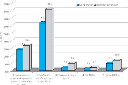 Динамика прироста показателей физической подготовленности Для проверки влияния прироста показателей ритмичности на увеличение уровня других двигательных координаций был проведен педагогический эксперимент, в котором приняли участие 52 человека. Занимающиеся - студентки технического университета 17-19 лет были распределены на две группы: контрольную (КГ) и экспериментальную (ЭГ), по 26 человек в каждой. Перед началом педагогического эксперимента и по его окончании было проведено тестирование для выявления динамики прироста показателей, характеризующих уровень общей физической подготовленности (см. рисунок). Исходный уровень развития ритмичности и ловкости выявлялся по разработанным нами тестам и критериям оценки (см. таблицу). Занятия в КГ проводились по программе, утвержденной Федерацией спортивной аэробики РФ. В ЭГ на каждом учебно-тренировочном занятии предлагались направленные системы упражнений для развития и совершенствования ритмичности. Целенаправленное формирование данной двигательной координации по ее основным разновидностям и проявлениям позволяет различать своеобразные закономерности распределения во времени и пространстве движения, вытекающие из задач и характера заданной мышечной работы; способствует более быстрому и качественному усвоению сложных двигательных навыков, разучиванию и запоминанию новых программ [6, 12]. Это создает мощные предпосылки прироста показателей других двигательных координаций: ловкости, точности, равновесия, пластичности, прыгучести и т. д. Выбор средств и методов направленного развития ритмичности обусловлен ее структурным содержанием, возрастом и уровнем физической подготовленности, функциональными возможностями центральной нервной системы, состоянием нервно мышечного аппарата, музыкально двигательными способностями, мотивацией занимающихся. В ходе педагогического эксперимента совершенствование ритмичности было направлено на формирование культуры движений, выработку индивидуального стиля; музыкального и двигательного ритма, специальной хореографической подготовки. В ЭГ развитию ритмичности по ее основным разновидностям и проявлениям отводилось от 20 до 25 % учебно-тренировочного времени в подготовительной части занятия и от 25 до 30 % - в основной. Каждая разновидность ритмичности обусловливала выбор специфических средств и методов обучения и тренировки. Так, для формирования ритмичности в базовых шагах занимающиеся овладевали навыком определения ритма в заданном двигательном действии, выделения фаз, главного момента приложения мышечных усилий; последовательности освоения пространственных, временных и силовых параметров в каждой фазе двигательного акта, запоминания последовательности действий и характера двигательных ощущений. Такой подход стимулировал закономерное повышение уровня развития ловкости и других двигательных координаций. Акцентирование внимания на выразительности моментов слитного выполнения движений, виртуозности, артистичности способствовало приросту показателей пластичности. Уровень развития ритмичности и ловкости (баллы) у занимающихся оздоровительной аэробикой, М±т