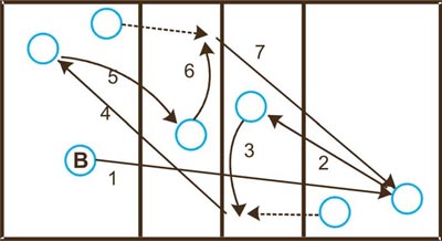 Для определения уровня технико-тактической подготовленности женщин, занимающихся волей болом, мы разработали комплексный игровой тест, представляющий собой комбинированное упражнение, в котором параллельно оценивались действия, выполняемые в нападении и защите. В нем учитывалась специфика игровой деятельности и особенности взаимодействий волейболистов массовых разрядов, за нимающихся в группах здоровья. Условия выполнения комбинированного упражнения максимально приближены к игровым ситуациям: одновременно с выполнением взаимодействий в нападении и защите, занимающиеся должны точно реагировать на смену ситуаций в моменты перехода от защиты к атаке, и наоборот. Стенографически были выявлены особенности игровой деятельности женщин, занимающихся в группе здоровья. Определены основные зоны взаимодействия (зона приема мяча и зона, в которую он затем направляется) - 5-3, 6-3, 4-3, основные зоны атаки и зоны, в которые направляется мяч после атаки; эффективность приема мяча в зонах 6, 5 и 1; наиболее часто применяемые способы завершения атаки. Оказалось, что реализация доигровых ситуаций осуществляется в основном через пасующего игрока зоны 3 (53%) и зоны 2 (20%). Чаще всего завершает атаку игрок зоны 4 (62%), мячи в основном направляются в зоны 6 - 34% и 5 - 40%. Разработанный тест выполняется следующим образом. Мяч вводится в игру (1) вспомогательным игроком В из глубины площадки броском мяча двумя руками из за головы (см. рисунок). Прием мяча (2) выполняется наиболее удобным способом - передачей снизу или сверху двумя руками защитником зоны 5 или игроком зоны 4 в зону 3, где располагается пасующий игрок. Передача для атакующего удара (3) выполняется в зону 4 двумя руками сверху. Передача должна быть средней или высокой и отведенной от сетки на 1,5-2 м, при этом технические ошибки не фиксируются (за исключением грубых). При неточном первом приеме разрешается выполнять передачу двумя руками снизу. Атакующий удар (4) выполняется с разбега в зону 5 и может быть заменен передачей мяча сверху двумя руками в прыжке, обманным ударом в зону 5 или 4, нападающим ударом способом "накат" или ударом по мячу кулаком в прыжке. Защитник направляет мяч (5) к сетке пасующему, который (6) передает мяч в зону 4 для атакующего удара в зону 5. После двух розыгрышей мяча игроки меняются зонами по часовой стрелке. Таким образом, каждый игрок поочередно выполняет функции защитника, пасующего и нападающего игрока. Комплексный тест для определения уровня игровой подготовленности женщин 30-40 лет, занимающихся волейболом При выполнении комбинированного упражнения фиксируется продолжительность "активной" фазы, продолжительность игрового фрагмента и количество технических приемов в активной фазе игры (таблица 1). "Активная" фаза - время розыгрыша мяча от момента первого приема в защите до выхода мяча из игры (А.В. Беляев, 2002). Игровой фрагмент - продолжительность розыгрыша мяча с момента первого приема до приема мяча после контратаки соперника. Научное обоснование. В исследовании приняли участие 30 женщин в возрасте 30-40 лет, занимающихся в группе здоровья. Всего было проанализировано 60 активных фаз при выполнении комбинированного упражнения. Результаты выполнения комбинированного упражнения подверглись статистической обработке с целью определения степени надежности и информативности 