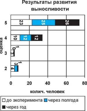 Рис. 3. Результаты развития выносливости в экспериментальной группе Результаты диагностики уровня саморазвития и профессионально-педагогической деятельности (по Л.Н. Бережновой), %