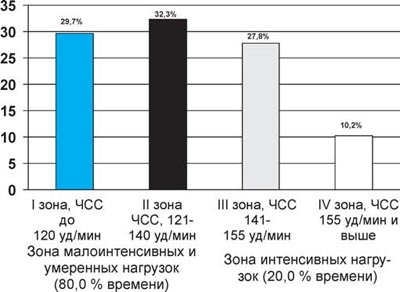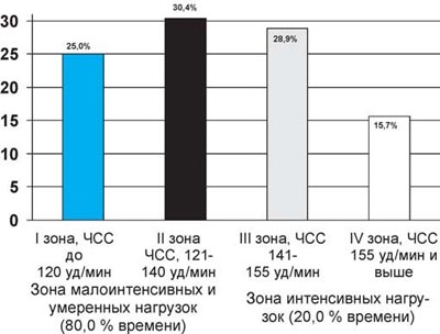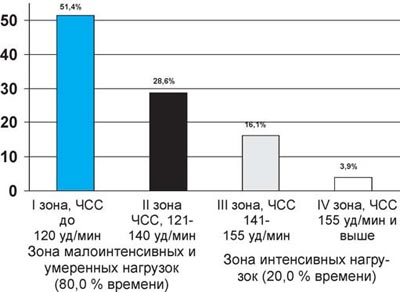 Рис. 4. Соотношение продолжительности и пульсовой стоимости нагрузок в процессе оздоровительной тренировки на 3-м году занятий 3-й год занятий (рис. 4) показал, что у занимающихся сформировались адаптивные процессы к нагрузкам различной интенсивности, однако доля малоинтенсивных и умеренных нагрузок оставалась на уровне 55-56 %, в то время как интенсивные нагрузки продолжали расти - составили около 45 %. Исследования также показали, что дальнейшее увеличение времени использования нагрузок интенсивного характера в оздоровительных тренировках женщин старшего возраста нежелательно и может привести к негативным процессам в организме. Однако кратковременные нагрузки, вызывающие кислородный долг, допустимы для занимающихся с большим стажем тренировочных занятий и достаточно подготовленных. Таким образом, нагрузки, предложенные нами для занимающихся оздоровительной тренировкой, характеризуются основными современными методическими направлениями: 1. Режимы по типу "удовольствие-эффект". Суть в том, что продолжительность нагрузки и интенсивность ее выполнения определяются способностью занимающихся выполнять их до состояния, исключающего выраженное утомление. 2. Режимы с более высокой нагрузкой, когда упражнение выполняется не только в "свежем" состоянии, но даже при выраженном утомлении, хотя и непредельном. Особое значение придается определению интенсивности. Она, как правило, фактически соответствует уровню ПАНО занимающихся. 3. Оздоровительные режимы, где допускается и даже считается необходимым выполнение физических нагрузок с околопредельной и предельной для данного возраста интенсивностью или выполнение нагрузок всего диапазона мощности. Возникает вопрос: к какой категории следует отнести исследованный нами режим нагрузок? Ответ однозначен - к средству массовой физической культуры оздоровительного типа.