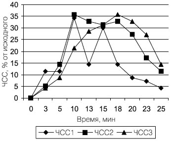 Изменение ЧСС в ходе занятий иппотерапией (ЧСС 1 - начало курса, ЧСС 2 - середина, ЧСС 3 - окончание) При проведении занятий особое внимание обращали на правильную посадку ребенка на лошади. Отмечено, что у большинства детей, принимавших участие в эксперименте, заметное улучшение осанки при посадке на лошади наступало на 3 - 4 м занятии, что можно объяснить более рациональным распределением мышечного тонуса, снижением уровня напряженности мышц и активизацией функций вестибулярной и проприоцептивной анализа торных систем. Когда дети осваивались с темпом передвижения лошади и чувствовали себя достаточно уверенно, им предлагали комплекс упражнений. Исследование состояния сердечно сосудистой системы по показателям частоты сердечных сокращений (ЧСС) проводилось в начале, середине и заключительной части цикла. На рисунке приведены данные, показывающие изменения ЧСС в процентах от исходного уровня, за который принималась ЧСС в первые минуты нахождения в седле. Отмечено, что в начале курса иппотерапии у детей наблюдается нестабильность сердечного ритма, которая выражается в резких изменениях величины ЧСС. В середине курса происходит некоторое сглаживание колебаний, а на последних занятиях пульс изменяется плавно. При анализе величины ЧСС в состоянии покоя до начала тренировок и после их окончания установлено, что у 6 участников эксперимента произошло снижение ЧСС на 10-15 % и у одного ребенка величина показателя не изменилась. Основываясь на полученных данных, можно предположить, что в результате занятий иппотерапией перераспределился тонус отделов вегетативной нервной систем, что привело к урежению сердечного ритма - брадикардии. Кроме того, перераспределение мышечного тонуса и улучшение осанки сопровождалось улучшением экскурсии грудной клетки и оптимизацией дыхательного стереотипа, т. е. улучшением аэробного энергообразования в тканях [1]. У участников эксперимента измеряли подвижность в суставах правой и левой стороны тела: плечевом, локтевом, лучелоктевом, лучезапястном, тазобедренном, коленном и голеностопном. Определяли угол сгибания, разгибания, отведения, приведения, возможности выполнения круговых движений. Установлено, что изменения в подвижности суставов верхних конечностей отсутствуют, в то время как в су ставах нижних конечностей наблюдалось увеличение амплитуды движений на 3-8о. Следует отметить, что некоторые пациенты, до эксперимента не имевшие возможности стоять без опоры, смогли самостоятельно стоять в течение 30-40 с после нескольких занятий, причем с увеличением количества занятий это время увеличивалось. Двое детей к окончанию курса начали делать короткие самостоятельные пробежки. Эмоциональное состояние "всадника", которое оценивалось волонтерами при наблюдении за ним в течение занятий, не всегда было адекватным и зависело от многих обстоятельств. Однако можно отметить, что тенденция к его стабилизации и улучшению наблюдалась у всех детей к концу курса иппотерапии. Так, если у всех участников эксперимента на первых занятиях оно было определено знаками "-" или "+", то к окончанию курса оно определялось знаками "+++". По наблюдениям родителей, у всех участников эксперимента отмечалось улучшение состояния вестибулярного анализатора и координационных способностей, развитие двигательных навыков, ум