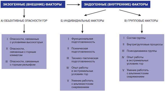 Актуальность. На успешность деятельности альпинистов высокой квалификации в условиях горной среды влияет целый ряд внешних повреждающих факторов. В экстремальных условиях высокогорья спортсмены могут противостоять этим факторам, только используя индивидуальные и внутригрупповые ресурсы. Данная проблема является малоизученной и требует научного исследования и обоснования. Цель исследования. Разработка концепции обеспечения успешной и безопасной деятельности альпинистов высокой квалификации при совершении восхождений в экстремальных условиях горной среды. Задачи. 1) Выявление внешних экстремальных факторов горной среды; 2) Выявление внутренних факторов, влияющих на успешность деятельности альпинистов высокой квалификации в условиях гор; 3) Анализ и систематизация влияния экзогенных и эндогенных факторов на успешность деятельности. Методы исследования. 1) Анализ литературных данных; 2) Опрос и анкетирование; 3) Включенное наблюдение; 4) Статистический анализ. Обсуждение результатов. Среди всех факторов, влияющих на успешность и безопасность деятельности спортсменов в горах, наши исследования позволили выделить три большие группы внешних (экзогенных, средовых) и внутренних (эндогенных, индивидуально-групповых) факторов (рис. 1): А. Экстремальные факторы внешней среды или объективные опасности гор. Б. Индивидуальные факторы. В. Групповые факторы. Рассмотрим эти группы внешних и внутренних факторов влияющих на спортсмена в высокогорье.
