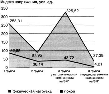 Рис. 1. Показатели индекса напряжения в покое и после нагрузки в группах спортсменов в зависимости от реакции на физическую нагрузку Средний уровень спортивного результата у лиц этой группы составил 23,54 ±0,28 мин. У спортсменов второй группы показатели исходного вегетативного тонуса и вегетативной реактивности практически не отличались от таковых у велосипедистов первой группы. Однако индекс напряжения после физической нагрузки ниже по сравнению со спортсменами первой группы (Р< 0,05). Это свидетельствует о менее выраженном влиянии симпатического звена ВНС при обеспечении физической нагрузки и, следовательно, об ухудшении вегетативного обеспечения деятельности. Средний уровень спортивного результата у спортсменов этой группы составил 24,57±0,54 мин. Различия результатов со спортсменами первой группы значимы. Третью группу мы разделили на спортсменов с предпатологическими и патологическими изменениями на электрокардиограмме. Для спортсменов с патологическим спортивным сердцем оказалась характерной исходная ваготония, асимпатикотонический тип вегетативной реактивности и избыточное вегетативное обеспечение. Это свидетельствует о значительном напряжении компенсаторных механизмов при интенсивной физической нагрузке. У спортсменов с предпатологическим состоянием сердечно-сосудистой системы отмечена исходная ваготония с выраженной брадиаритмией, гиперсимпатикотонический тип вегетативной реактивности и недостаточное вегетативное обеспечение, что указывает на истощение механизмов компенсации при обеспечении длительной нагрузки. Средний уровень спортивного результата у представителей этой группы составил 25,43 ±0,32 мин. Различия результатов со спортсменами обеих первых групп значимы. Для изучения особенностей функционального состояния вегетативной нервной системы у спортсменов в зависимости от уровня их результативности, отражающей аэробную подготовленность спортсменов, мы определили среднюю величину спортивного результата индивидуальной гонки на 15 км и разделили велосипедистов на две группы. В первую группу вошли спортсмены (п=9) со спортивным результатом выше средней величины; вторую группу составили спортсмены (п=11) со спортивным результатом ниже средней величины. Так, средний уровень результата первой группы спортсменов составил 20,91 ±0,47 мин, а второй - 23,06 + 0,86 мин. Различия между группами по спортивному результату были значимыми (Р<0,05). Анализ механизмов регуляции сердечного ритма у велосипедистов в условиях физиологического покоя и при ортостазе показал, что средние величины моды, амплитуды моды, вариационного размаха, индекса напряжения практически не отличались у спортсменов двух групп (таблица 1). Практически все средние показатели кардиоинтервалограммы после физической нагрузки значимо отличались у спортсменов обеих групп. Необходимо отметить, что для велосипедистов 2-й группы характерны меньшая мода, большая амплитуда моды и индекс напряжения (Р<0,05), что свидетельствует о более значительном напряжении механизмов компенсации при обеспечении физической нагрузки у велосипедистов с меньшим уровнем спортивного результата по сравнению со спортсменами 1-й группы. Индивидуальный анализ показателей кардиоинтервалограммы установил, что у 55,6% спортсменов 1-й группы асимпатикотоническая вегета