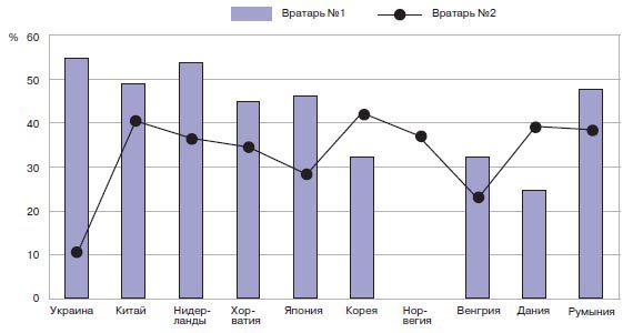 Рис. 2. Общая результативность задержания мяча вратарями