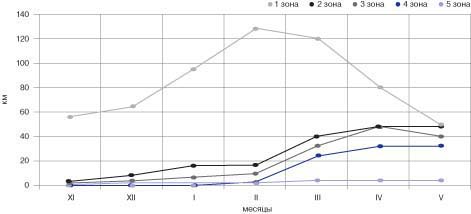 Рис. 1. Распределение объемов плавания по зонам интенсивности в подготовительном периоде у членов команды СКА МВО по подводному ориентированию