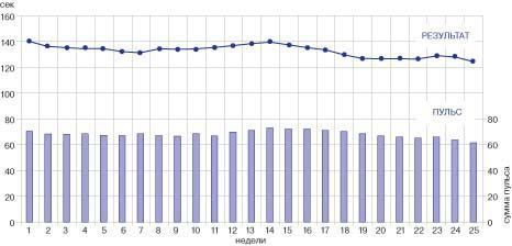 Рис. 2. Динамика показателей ЧСС и времени на дистанции в подготовительном периоде (мужчины, n=4)