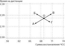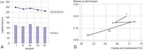 Рис. 4. Две формы представления результатов тестирования: А - линейная, Б - двумерная Согласно схеме каждую неделю, в понедельник (после дня отдыха), после стандартной разминки пловцы должны были преодолевать дистанцию 200 м в среднем ("удобном для себя") темпе. Затем участники эксперимента самостоятельно подсчитывали ЧСС за 10 с по командам экспериментатора непосредственно после окончания заплыва, а также спустя 1 и 2 мин после его окончания. Для оценки результатов теста учитывались время проплывания дистанции и сумма пульса при восстановлении (рис. 2). Из приведенных данных видно, что результат на дистанции 200 м и сумма пульса восстановления меняются на протяжении всего подготовительного периода. Изменения носят статистически достоверный характер (р<0,05). При сопоставлении показателей объема и интенсивности тренировочных нагрузок пловцов-подводников с результатами, полученными в результате теста, была обнаружена тесная связь. Наличие такой связи позволяет эффективно контролировать текущее состояние пловцов-подводников по результатам простого теста, включающего фиксирование результата на дистанции 200 м и подсчета ЧСС в период восстановления (аналогичные изменения отмечены у девушек). Таким образом, выбранная методика оценки функционального состояния пловцов-подводников оказалась достаточно информативной и относительно простой. Данный тест легко вписывается в программу тренировочных занятий и необременителен для спортсменов. Также в представленном виде результаты теста недостаточно информативны для восприятия специалистами. Для повышения информативности представления результатов теста мы предложили отобразить данные, полученный при выполнении этого теста в двумерном представлении его результатов. Иными словами, по оси абсцисс (Х) отражаются значения суммы пульса восстановления, а по оси ординат (Y) - результаты проплывания 200-метровой дистанции (рис. 3). При подобном отображении результатов теста формируется так называемое "поле функционального состояния пловца". В точке пересечения двух векторов, характеризующих результат на дистанции и сумму пульса восстановления, ставится точка-маркер, которая характеризует текущее состояние пловца. Изменение любой из двух составляющих результатов теста сразу же приводит к смещению точки-маркера. Исходя из изложенных представлений, отобразим результаты изучаемого теста в сравнении с традиционной формой, рассмотренной в начале данной статьи. Для наглядности представим результаты не всех измерений, полученных за время наблюдений, а только части из них, а именно результаты полученные на 1, 8, 16, 23-й и 25-й неделях. На рис. 4 представлены результаты, полученные при выполнении пловцами изучаемого теста, в традиционной форме (А) и в двумерном представлении (Б). Заключение Результаты исследования дополняют имеющиеся литературные сведения о методах оценки функционального состояния квалифицированных пловцов и могут быть использованы для повышения эффективности педагогического контроля в процессе подготовки квалифицированных спортсменов. Выбранный тест является доступным и не требует сложного оборудования. Двумерное представление результатов теста повышает эффективность оценки функционального состояния пловцов-подводников. При этом по оси абсцисс целесообразно отражать 