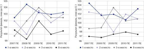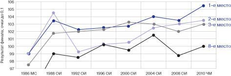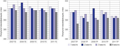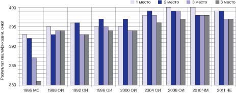Введение. Начиная с 1971 г., ежегодно стали проводиться чемпионаты Европы в стрельбе из пневматического оружия среди мужчин, женщин, юниоров. С 1984 г. стрельба из пневматического оружия среди мужчин и женщин входит в программу Олимпийских игр [1]. За прошедшие годы одним из наиболее значимых изменений является введение с 1986 г. финальных соревнований во всех упражнениях олимпийской программы и соответственно дебют финалов на Играх XXIV Олимпиады в Сеуле в 1988 г. Наряду с этим за последние два - три десятка лет произошла техническая революция в оснащении спортсменов-стрелков в пулевой стрельбе. Все это отразилось на результатах. Сегодня рекорды, мира, Европы и России в стрельбе из пневматической винтовки у мужчин и женщин равны абсолютному результату 600 очков из 600 возможных и 400 из 400 очков соответственно. Зачастую победителей и призеров официальных международных соревнований по итогам финала разделяет одна-две десятых очка. Такая жесткая конкуренция требует более углубленного подхода к подготовке спортсменов, особенно на уровне юниорского состава сборной России. Цель исследования заключалась в выявлении динамики соревновательного уровня квалификационных и финальных результатов на крупных международных соревнованиях и определении наиболее значимых показателей модельных характеристик техники выполнения выстрела. Методы исследования: анализ научной и учебно-методической литературы, анализ протоколов соревнований с 1986 г. по настоящее время, педагогическое наблюдение, анкетирование, хронометрирование, пульсометрия, тестирование на стрелково-компьютерном тренажере СКАТТ и контрольная стрельба, статистический анализ. Результаты исследования. Обобщение результатов соревнований, рассматриваемых с введения финалов, в которых после выполнения квалификационного упражнения (60 и 40 зачетных выстрелов у мужчин и женщин соответственно) лучшие 8 спортсменов производят еще 10 выстрелов с учетом десятых долей очка, которые приплюсовываются к квалификационному результату, при этом на один финальный выстрел отводится 75 с. В качестве примера приведем сводные данные результатов женщин в стрельбе из пневматической винтовки после введения финалов на крупных международных соревнованиях (см. таблицу) и соответствующей диаграммы (рис.1). Для анализа выбрано упражнение из пневматического оружия, т.к. оно выполняется в помещении, где на результат не влияют погодные условия. Вначале мы видим, что при введении финалов они не влияли на распределение лидеров квалификации, т.к. разрыв между 1-м и 8-м местами был большим. Затем уровень результатов повысился не только у одного-двух мировых лидеров, но и у первой десятки в мировом рейтинге, и по итогам квалификации разница между 1-м и 8-м местами стала составлять 2-3 очка. При этом роль финальной серии значительно возросла, и при ее успешном выполнении спортсменам с замыкающих финальных мест стало возможно бороться за призовые места. Аналогичную картину мы получили при анализе результатов у мужчин. Вместе с этим результаты российских юниоров и юниорок отстают от международного уровня (рис. 2). Согласно представленным данным сегодня победа на крупных международных соревнованиях возможна при превосходстве в финальной серии не менее 104,0. Поскольку сегодня разница в финале уже редко составляет более 2 оч