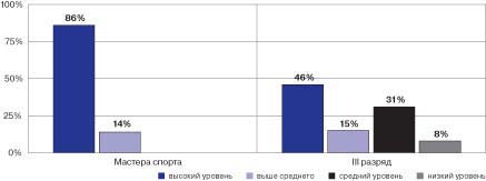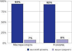 Рис. 1. Оценка уровня максимального потребления кислорода альпинистами различной квалификации Как видно из рис. 2, в группе мастеров спорта у всех испытуемых наблюдается высокий и выше среднего уровени физической работоспособности. Отличительной особенностью является тот факт, что у начинающих спортсменов высокий и выше среднего уровни работоспособности имеют лишь 46 и 15% испытуемых; 31% - средний уровень и 8% - низкий уровень работоспособности.