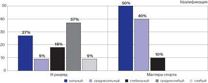 Рис. 3. Соотношение типов нервной системы альпинистов различной квалификации В группе начинающих спортсменов обладателями сильного и среднесильного типа НС являются 27 и 9% испытуемых. 37% испытуемых имеют среднеслабый НС и 9% - слабую нервную систему, т. е. они обладают большей чувствительностью и реагируют даже на самые слабые раздражители, неспособны долго противостоять стрессу, неблагоприятным условиям среды и т. д. Как показано во многих исследованиях, сила-слабость НС существенно влияет на индивидуальный стиль деятельности. Поэтому результаты диагностики этого типологического свойства НС следует учитывать в процессе обучения и воспитания при формировании индивидуального стиля деятельности и поведения. Представленный материал дает основание полагать, что при прочих равных условиях преимущество в преодолении трудностей на восхождении имеют спортсмены с более сильным типом нервной системы, что является весомым фактором при планировании подготовки, формировании альпинистских групп и выборе тактики восхождения. Литература 1. Байковский Ю.В. Факторы, определяющие тренировку спортсмена в условиях среднегорья и высокогорья: моногр. / Ю. В. Байковский, Т. В. Байковская. - М. : Физкультура и спорт, 2009. - 232 с. 2. Белоцерковский З.Б. Эргометрические и кардиологические критерии физической работоспособности у спортсменов / З.Б. Белоцерковский. - М.: Советский спорт, 2005. - 312 с. 3. Газенко О.Г. Физиология человека в условиях высокогорья / О. Г. Газенко. - М.: Наука, 1987. - 520 с. 4. Психология экстремальных ситуаций: хрестоматия / [сост. А. Е. Тарас, К. В. Сельченок]. - Минск : Харвест, 2000. - 480 с. 5. Солодков А. С. Физиология человека: общая спортивная, возрастная. - учебник для вузов ФК / А.С. Солодков, Е.Б. Сологуб. - М.: Олимпия - Пресс, 2005. 6. Уилмор Дж.Х., Костилл Д.Л. Физиология спорта и двигательной деятельности: пер с англ. / Дж. Х. Уилмор, Д.Л. Костилл. - Киев: Олимпийская литература, 1997. - 503 с. 7. Astrand P.O. Physiological aspects on corss country skiing at the high altitudes / P. O. Astrand // FISBullentin. - 1962. - N 1. - P. 35-38. 8. Buskirk E.R., Kollias J., Piconreatique E. (1967). The effects of altitude on physical performance (pp. 65-71). Chicago: Athletic Institute 9. Pollock M.L., (1987). Effect of age training on aerobic capacity and body composition of master athletes. Journal of Applied Physiology, 62, 725-731. |