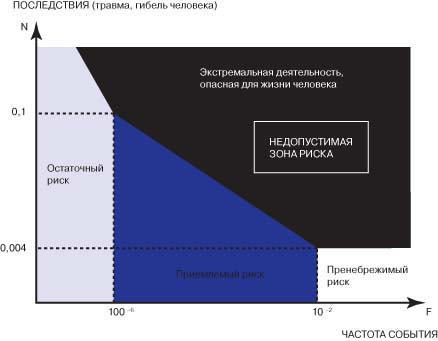 величины последствий аварии Основной смысл F/N - диаграммы (кривой Фармера) в следующем: аварии, вызывающие небольшой ущерб, приводящие к незначительным последствиям, отражающимся на здоровье и жизнях людей, могут случаться и случаются сравнительно часто. Регламентирование опасности ставит своей целью свести индивидуальный и групповой риск, связанный с этой опасностью, до уровня приемлемого. Приемлемый уровень смертельного риска при добровольном участии людей в том или ином опасном мероприятии на три порядка выше, чем при вынужденном. При уменьшении риска ниже уровня 10-6 в год общественность не выражает чрезмерной озабоченности, и поэтому редко предпринимаются специальные меры для снижения этой степени риска. Основываясь на этой предпосылке, ведущие специалисты в области обеспечения безопасности человека принимают величину 10-6 (например, вероятность гибели человека от удара молнии) как тот уровень, к которому следует стремиться при снижении риска. Нормативную величину предельно допустимого социального риска смерти (гибели) целесообразно установить на уровне 10-4 случаев в год при максимальном числе жертв, равном десяти. При этом показатель не более 10-6 в год является нормативной величиной пренебрежимого уровня социального риска. Исходя из теории риска, любая деятельность человека, попадающая в категорию чрезмерного риска недопустима, если даже она выгодна для общества в целом. Любая деятельность с уровнем приемлемого риска должна регулироваться специальным органом контроля. К этой категории относятся горные виды спорта, поэтому в России созданы Поисково-спасательные пункты, в обязанности которых входят вопросы регулирования безопасности деятельности человека, а также установлена система контроля общественными организациями, занимающимися развитием горных видов спорта (общественный спасательный отряд Федерации альпинизма России и спасатели Туристского спортивного союза России). Любая деятельность, входящая в пренебрежимый уровень риска, может не контролироваться регулирующим органом, то есть не носит запретительного характера. К этой категории относится деятельность, связанная с оздоровительной активностью в горах (трекинги, походы выходного дня и др.). Если при оценке риска установлено, что его величина находится "между двумя линиями", разграничивающими зоны приемлемого и неприемлемого рисков, то для снижения риска необходимо принять такие меры, которые считаются разумными с практической точки зрения, но не требуют неоправданно высоких затрат и неоправданно больших усилий. Это так называемый принцип ALARP (as low as reasonably applicable/practicable) - подход к управлению риском, который подразумевает его максимально возможное снижение, достигаемое за счет реально имеющихся (ограниченных) ресурсов (рис. 2).