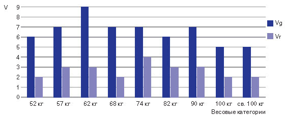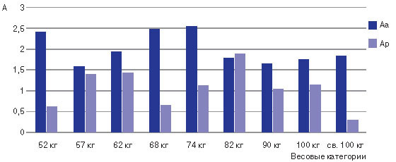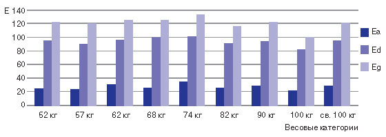 Актуальность. В последнее время, в связи со стремительным развитием боевого самбо на международной арене, сборной команде России становится все труднее удерживать лидерство. Так, на последнем Чемпионате мира 2011 г. в Литве (г. Вильнюс) результат российской сборной - 4 золотые медали, что значительно хуже предыдущего года, причем все "золото" завоевывалось в сложных схватках, где приходилось сражаться за каждый балл и до конца было неизвестно, на чьей стороне будет победа. Спортивные достижения в единоборствах определяются достаточно широким спектром требований, предъявляемых к спортсменам в ходе соревнований. В связи с этим дать однозначную оценку основных факторов, влияющих на спортивный результат, применительно к боевому самбо очень сложно: слишком широк арсенал технико-тактических действий. И наряду с возросшей конкуренцией это заставляет изучать данные технико-тактической подготовленности выдающихся спортсменов России и мира, выступающих на различных соревнованиях. Это в дальнейшем позволит создать модель чемпиона, к которой спортсменам следует стремиться в тренировках и соревнованиях. Модельные характеристики позволят тренеру и спортсмену в наглядной форме сопоставить технико-тактическую подготовленность спортсмена и его противников, определить сильные и слабые стороны. Существует ряд показателей, характеризующих подготовленность спортсменов. В данном исследовании были определены показатели технико-тактической подготовленности чемпионов мира 2011 г. в Литве (г. Вильнюс) во всех весовых категориях. Методы исследования. Для определения модельных параметров соревновательной деятельности боевых самбистов проводилось педагогическое наблюдение. Видеоматериал с записями схваток Чемпионата мира 2011 г. обрабатывался с помощью стенографической записи специально разработанными символами [5, 6]. Фиксировались действия, качество выполнения (оценки) и ряд других параметров. Результаты наблюдений математически обрабатывались для определения количественных параметров модели [5]. Система стенографической записи и параметры технико-тактической подготовленности спортсменов были предложены Е. М. Чумаковым. Рассчитывались показатели соревновательной деятельности: эффективность нападения (Еа) и эффективность защиты (Еd), общая эффективность (Еg), активность нападения (Аа), активность защиты (Аd), вариативность общая (Vg), вариативность результативная (Vp), результативность нападения (Ra), результативность защиты (Rd), общая результативность (Rg). Эффективность - соотношение удачно выполненных попыток проведения приемов к общему количеству попыток в процентах. Этот показатель позволяет количественно оценить качественные изменения технико-тактической подготовленности и определяется по формуле: Еа=(х/Х) х 100%, (1) где Еа - показатель эффективности нападения, х - количество удачных попыток (оцененных), Х - общее количество попыток выполнения технико-тактических действий. E(d)=100%-(у/Y) х 100%, (2) где E(d) - показатель эффективности защиты, у - количество удачных попыток соперников (оцененных), Y - общее количество попыток выполнения соперниками технико-тактических действий. Еg=Еа+Еp, (3) где Еg - показатель общей эффективности, Еа - показатель эффективности нападения, Еd - показатель эффективности защиты. Активность - количество попыток выполнения