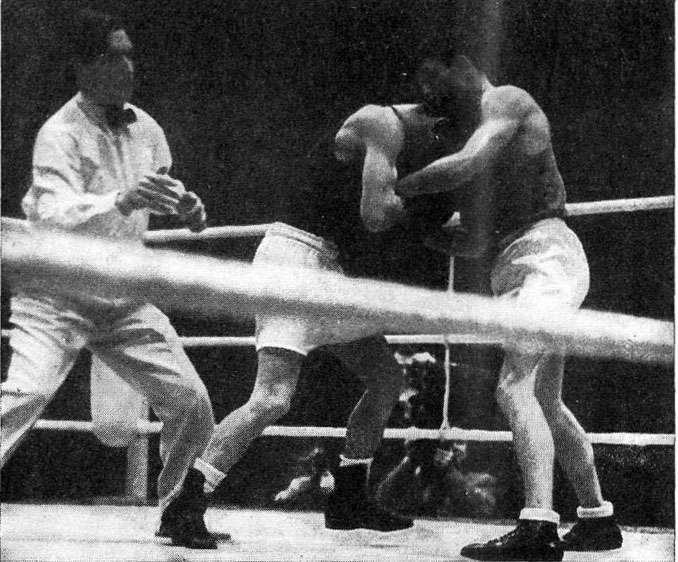 | Бои боксеров на современном этапе развития носят напряженный, часто силовой характер и отличаются большой плотностью. И нередко мы видим, как боксеры, израсходовав весь запас сил, проводят заключительную «трехминутку» в объятиях и захватах противника, значительно понижая свою активность. Причем эти же боксеры на занятиях в учебно-тренировочном процессе проводят по 5 — 10 раундов боя и не утомляются так, как на соревнованиях. Все дело в том, что в процессе тренировочных боев боксеры спокойны, расчетливы и, не напрягаясь, наносят более легкие, чем в соревнованиях, удары. Во время же соревновательного боя боксеры обычно находятся в состоянии сильного возбуждения и напряжения, подвергаясь обстрелу сильными ударами со стороны неизвестного противника. Нередко им приходится боксировать в несвойственной манере боя, наносить большое количество сильных ударов, забывая о дифференцировании силы ударов (если только с ним не проводились до этого специальные тренировки). Иногда боксеры применяют сильные удары, заранее зная, что эти удары не достигнут цели, а наносят их для того, чтобы «отпугнут» противника или сорвать его очередную атаку. Повышенное напряжение мышц во время боя и нанесение большего количества сильных ударов, чем этого требует ситуация, при- |